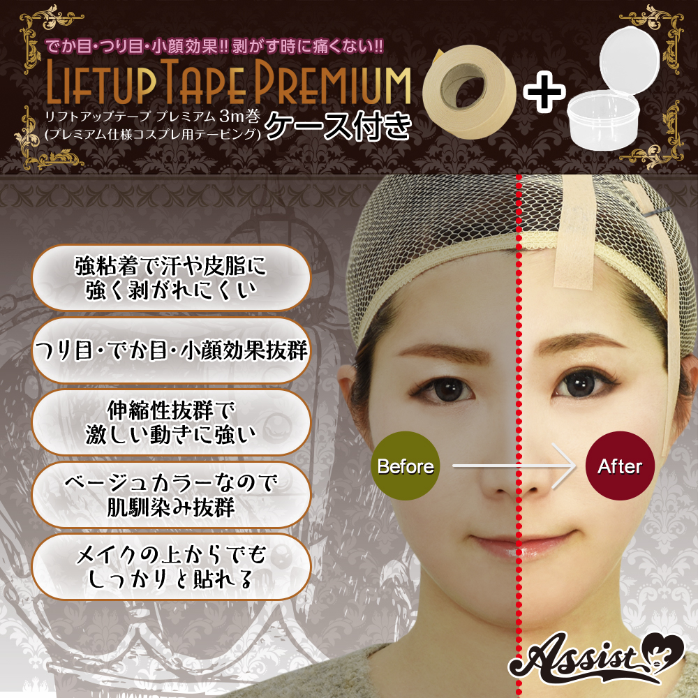 でか目・つり目・小顔を表現するのに最適な、アシストオリジナルのコスプレ専用テーピングです。強粘着で汗や皮脂に強く、通気性抜群で肌にも優しいです。抜群の伸縮性で激しい動きに強く、上からメイクも可能です。ベージュカラーなので肌馴染みも良いです。