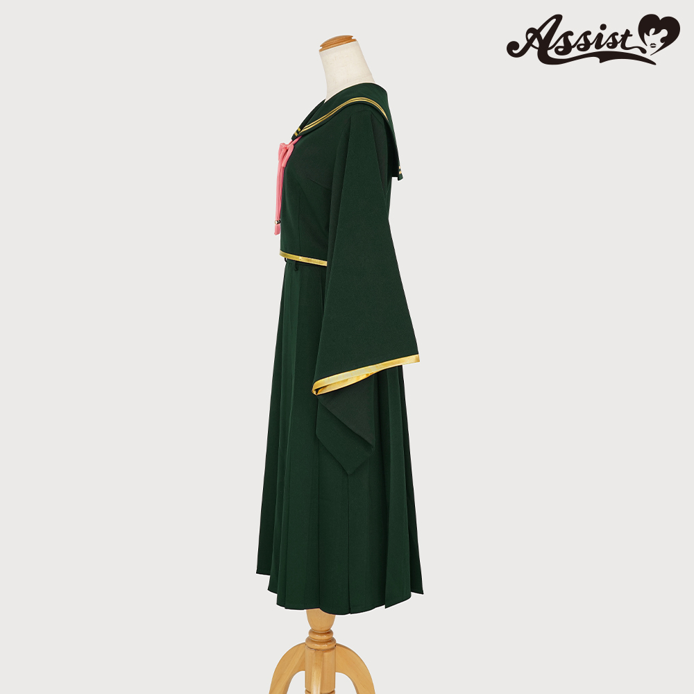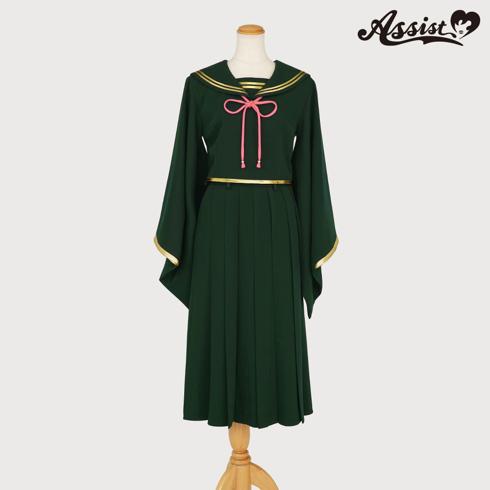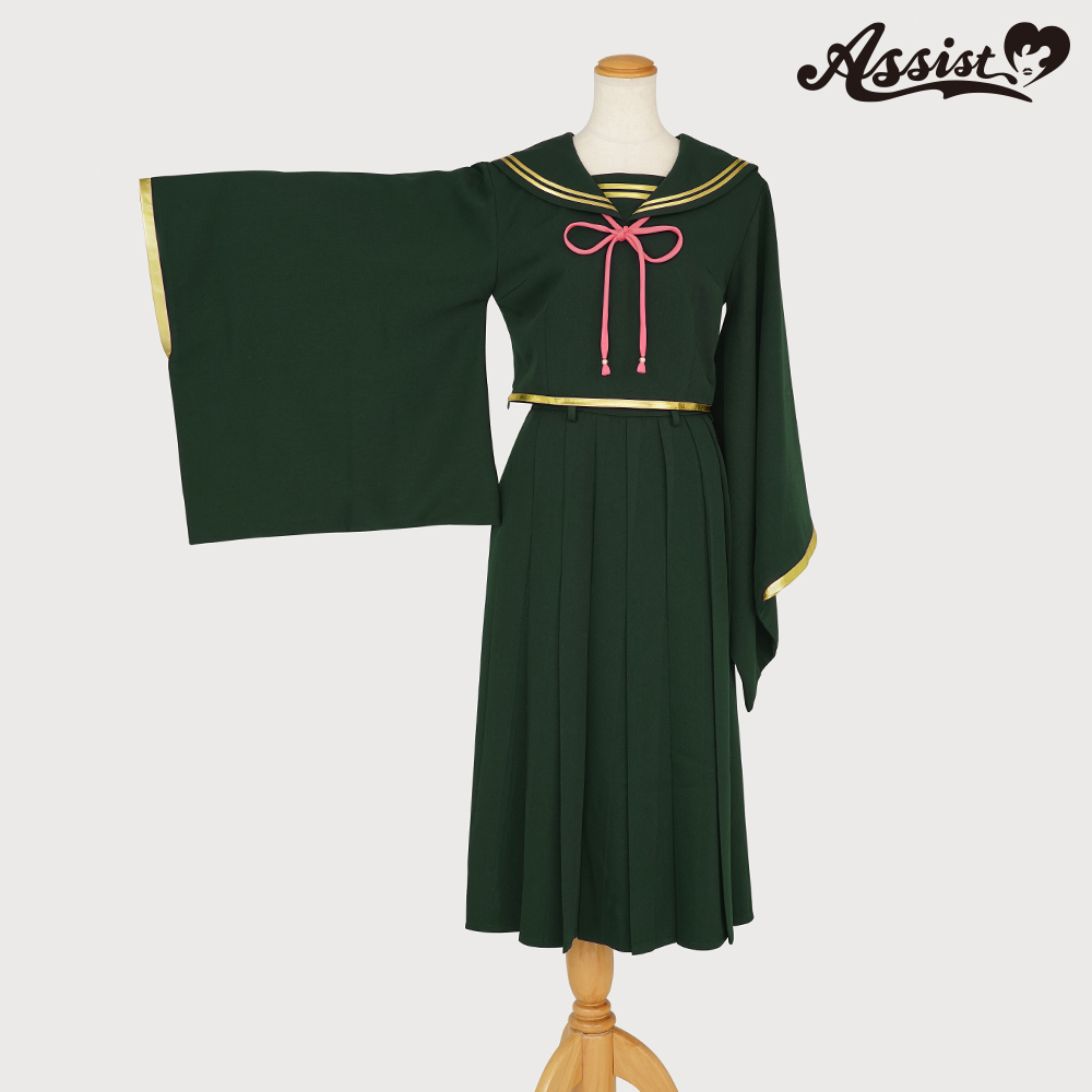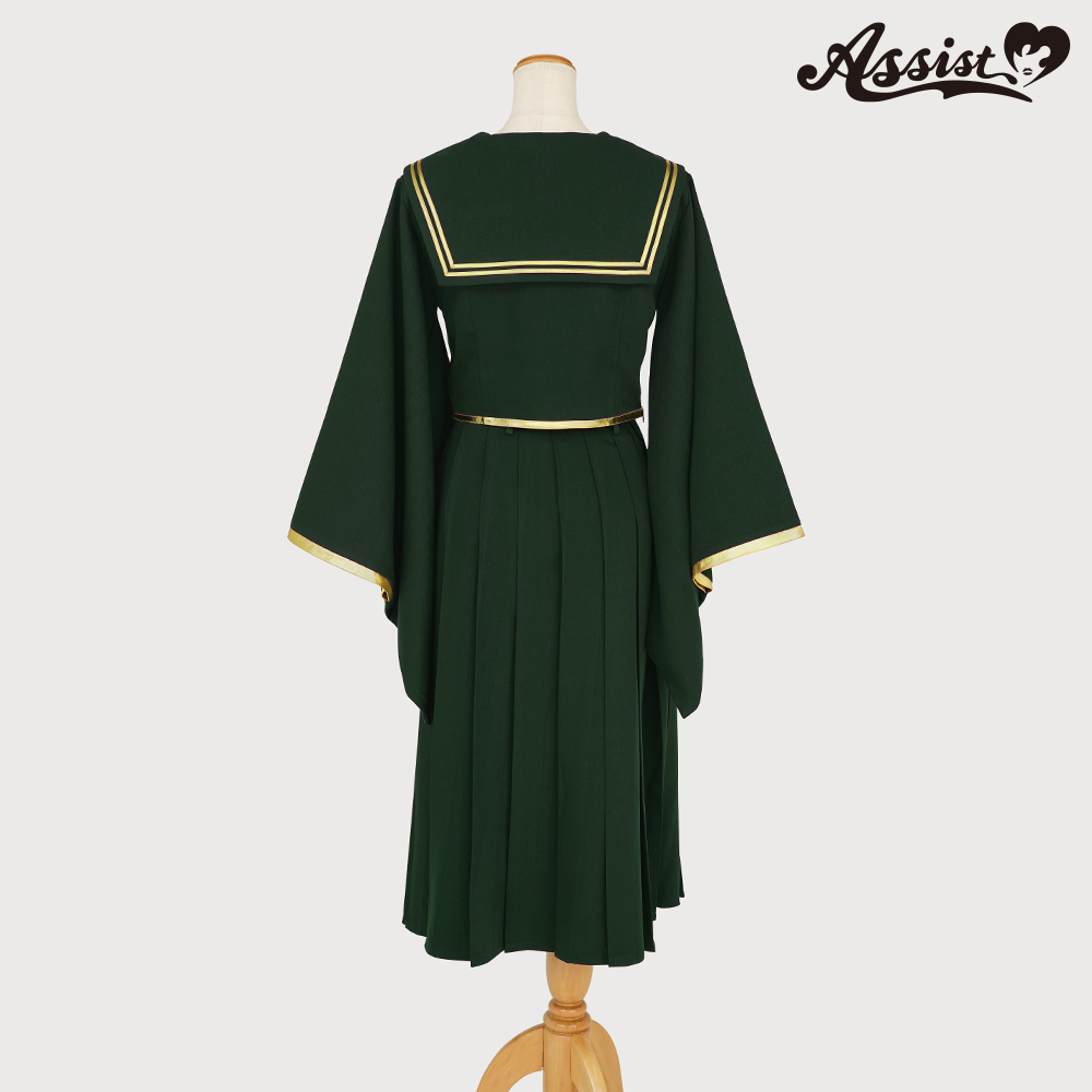 深みのあるグリーンに金縁ラインを組み合わせて、ウエストが少し見えるようにセーラー服の丈を再現。